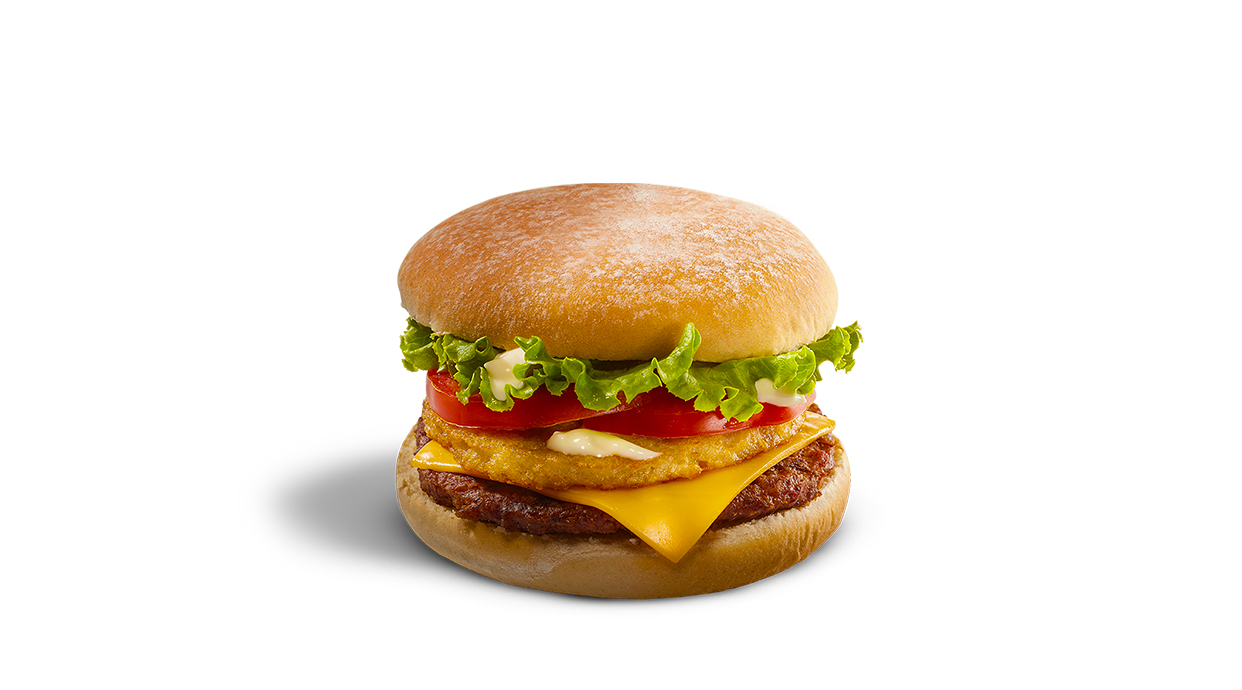 Pan enharinado, Bistec de Res, Tortita de Papa, Ensalada Iceberg, Tomate, Cheddar, Salsa Mayonesa.